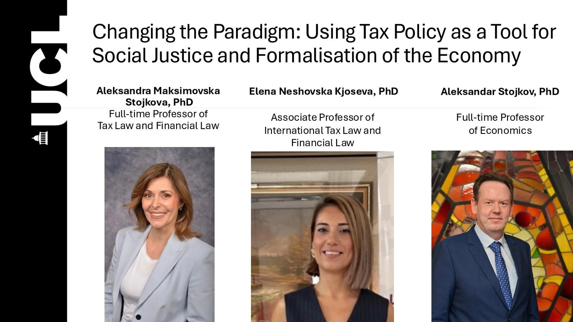 Our speakers are visiting from Iustinianus Primus Law Faculty, in Skopje, where Aleksandra Maksimovska Stojkova is a Professor of Tax Law and Financial Law, Elena Neshovska Kjoseva is an Associate Professor of International Tax Law and Financial Law and Aleksandar Stojkov is a Professor of Economics.